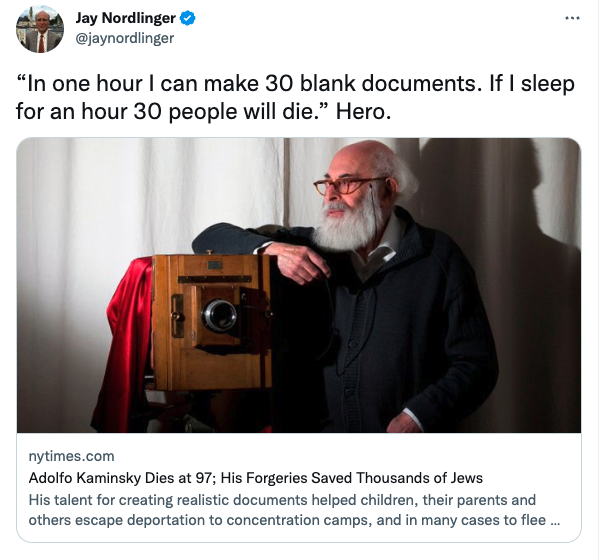 Don't miss the New York Times obituary of Adolfo Kaminsky. He died Monday at the age of 97 and was responsible for saving thousands of Jews from concentration camps during World War II.